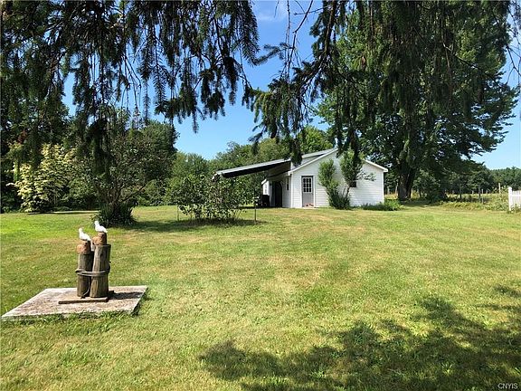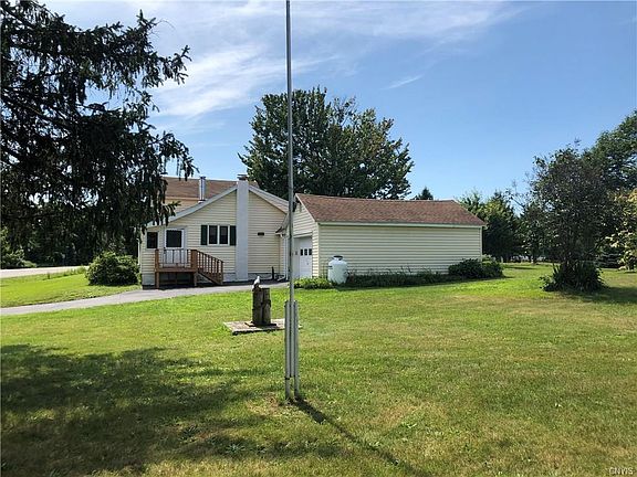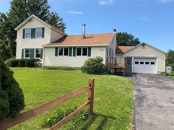 Welcome to this 1.20 acres of country living. Check out this serene backyard setting with a huge detached garage/barn. Plenty of room for your workshop and storage as there is an attached shed. This home has a beautiful country kitchen with pull out cabinet drawers in the pantry. The living area is open to the back deck and an enclosed 3 season porch. There is a first floor bedroom, large full bath along with spacious laundry area that includes a sink and a freezer. All this on one level! Upstairs has an added area for a desk overlooking the backyard along with another bedroom. For additional warmth in the winter is a woodstove with a blower. Get ready to enjoy nature out of every window. Deck leading to this wonderful backyard is so Awesome! All this for less than it cost to rent an apt.
