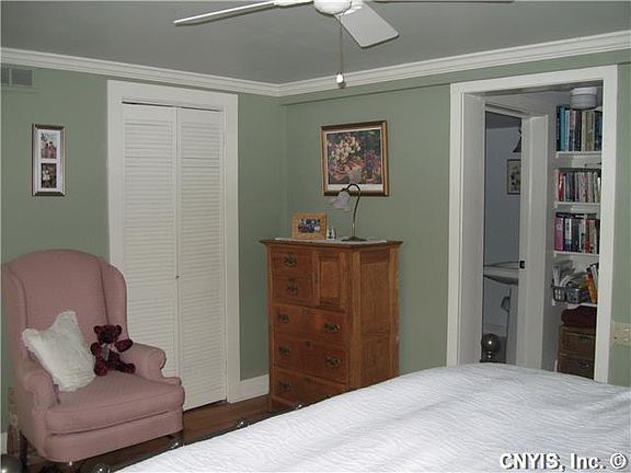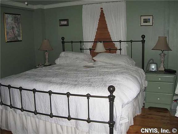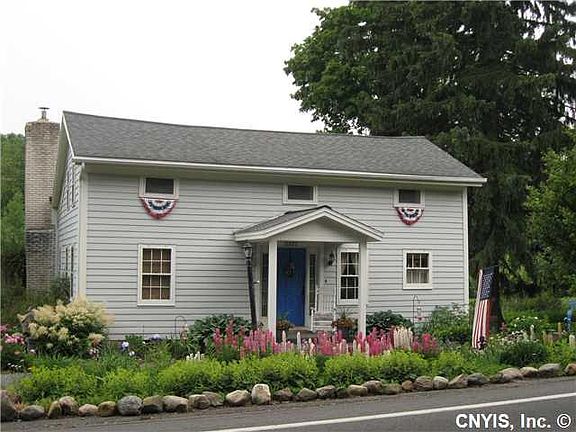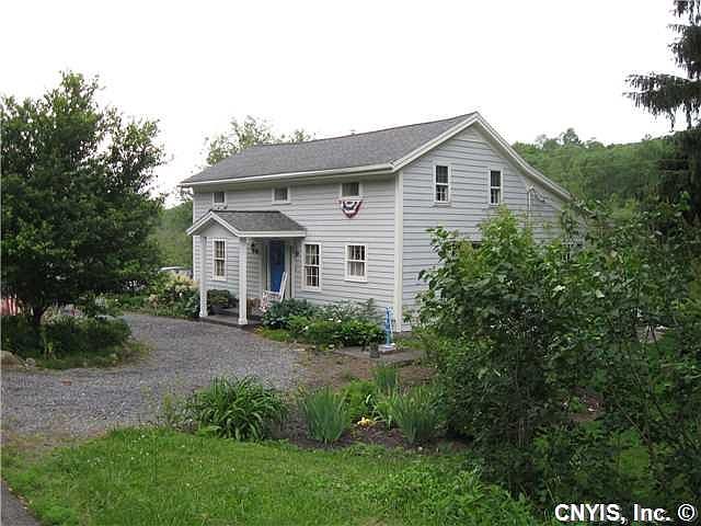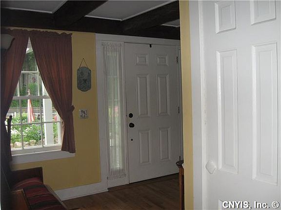 The house sits on 5 acres and has a beautiful landscaped yard. There is a large carriage barn near the house. The home has loads of character. The first floor has a large great room with windows on 3 sides, French doors opening on the deck, a fireplace, and exposed beams, The kitchen has solid maple. white shaker cabinets, granite counter tops, high end stainless steel appliances; large master suite; hardwood floors. There are 2 large bedrooms and a full bath upstairs. Entire house is loaded with closets and storage.