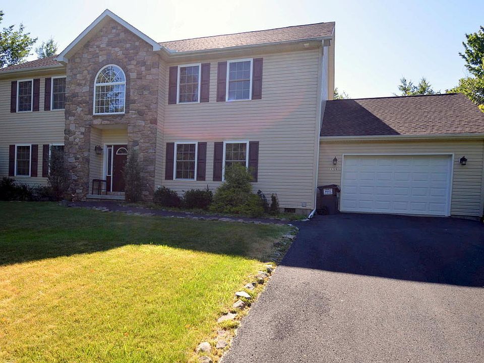 Spacious Colonial with gorgeous kitchen and baths is located in a country club community. Enter the home, and you are greeted by a grand staircase, large family room with brick fireplace on the left, and formal dining room on the right. Further, find a living room and granite-countered custom eat-in kitchen with sliders to the deck outside. Completing this floor is a convenient first-floor laundry and half bath. Upstairs, find a regal master bedroom with elevated ceiling, walk-in closet, and full en-suite bath with elevated ceilings. There are also two other bedrooms with walk-in closets, a fourth bedroom with wall closet, and spacious hallway bath. Pull down attic for storage. Outside is an attached garage, expansive deck, vegetable garden, and privacy treeline.