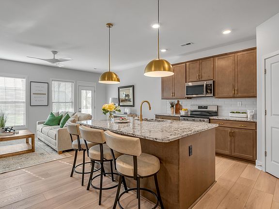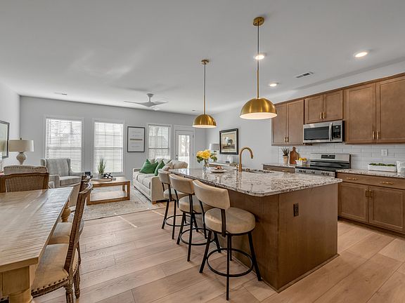 The Logan Square plan at the Peninsula Townhomes offers three bedrooms, two and a half-baths, and a one-car attached garage with an upscale, contemporary aesthetic. The first floor includes an open living space with kitchen, eating area, and family room open to one another. Townhomes feature 9' ceilings on both floors, a covered patio off the family room, electric vehicle charging outlet in the garage, and covered entry. The kitchen features Aristokraft Benton cabinets throughout with 42'' upper kitchen cabinets and island with painted shiplap, pendant lighting, and granite countertops with stainless large single bowl undermount kitchen sink. Appliance packages include disposal, dishwasher, smooth top electric range, over the range microwave, and side-by-side refrigerator. Bath 1 features a 5' shower with tile surround and two tile shelves, a double bowl vanity, and linen closet. Bath 2 has a tub'/shower combination and all bathrooms have raised vanities in baths with granite tops and rectangular bowls.. Enjoy the convenience and style of LVP flooring throughout first floor and in baths, utility room, WH closet, and carpet on stairs, upstairs hall, and in bedrooms. Luxurious, modern finish details include two-tone paint, Craftsman style trim, and ceiling fans in the family room and Bedroom 1. Enjoy the privacy and personal space of townhome living with all bedrooms on the second floor. All owners are members of the Peninsula Townhomes HOA, which provides exterior building maintenance and landscaping service, snow removal, and maintenance of common areas, as per the Declaration of Covenants, Conditions, and Restrictions.