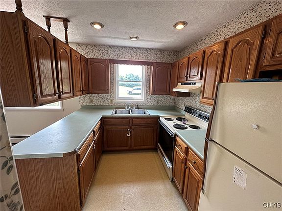 This is a charming two-bedroom one bath home located in Port Leyden New York. The exterior features durable vinyl siding and a low-maintenance steel roof, offering both a aesthetic appeal and long-lasting protection against the elements. The kitchen comes fully equipped with essential appliances including a refrigerator and stove, making it move in ready. Additionally, the home includes a washer and dryer, conveniently located to make laundry tasks easy. This home is also equipped with a oil-fired hot water boiler that is also the hot water source. There is also a smaller attached storage place to the left of the garage and behind the house there is an attached chicken coup.