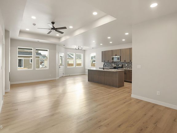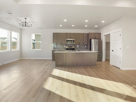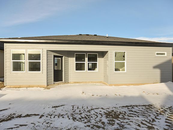 Discover modern living in this beautifully designed 3-bedroom, 2-bathroom ranch-style home located in the desirable Harvest Hills neighborhood, just steps from the high school and nearby parks. Step into an inviting open-plan layout with a neutral palette, perfect for personalizing your style. The living room boasts a cozy fireplace and abundant natural light from large windows. The kitchen is a chef's dream with a spacious island, quartz countertops, a tiled backsplash, wood stained cabinets, stainless steel appliances, and a convenient pantry. Enjoy the ease of a laundry room just off the kitchen and retreat to the private master suite, featuring a luxurious tiled shower, walk-in closet, and plenty of space to unwind. Relax or entertain on the back patio, and take advantage of the heated 2-car attached garage for comfort and convenience year-round. Don't miss the chance to call this stunning new build your home—schedule your showing today! Seller offering a $5,000 landscape credit.