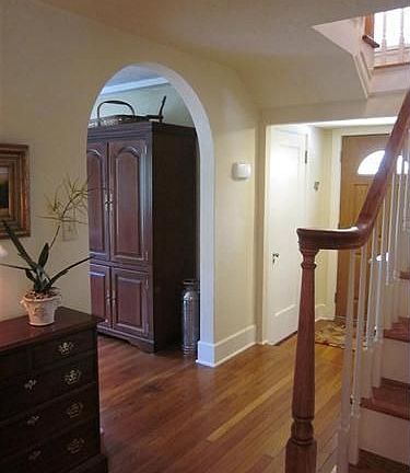 House Beautiful! Sunshine envelopes the living room which features refinished hardwood floors, bay window , beamed ceiling and woodburning fireplace. The formal dining room has side cupboards that were rebuilt and French doors that lead to screen porch. There is a small wine bar between the living and dining room. The kitchen has been updated with solid surface counters, stainless appliances and a tumbled marble backsplash. The master bedroom features a bay window, walk in closet and private bath. The bath was remodeled with a walk in tiled shower with glass doors, pedestal sink , lighting and fixtures. The other 2 bedrooms are connected by a newer jack and jill bath with ceramic tile , pedestal sink and bead board. The laundry is on the second floor. The third floor features 2 additional bedrooms and a full bath. The spacious yard has 2 patios. Other improvements include newer Pella windows, waterproofed basement, 200 amp electrical panel, garage roof and custom radiator covers.