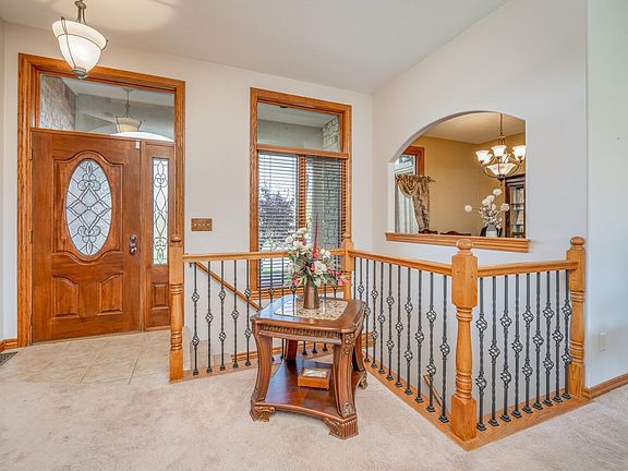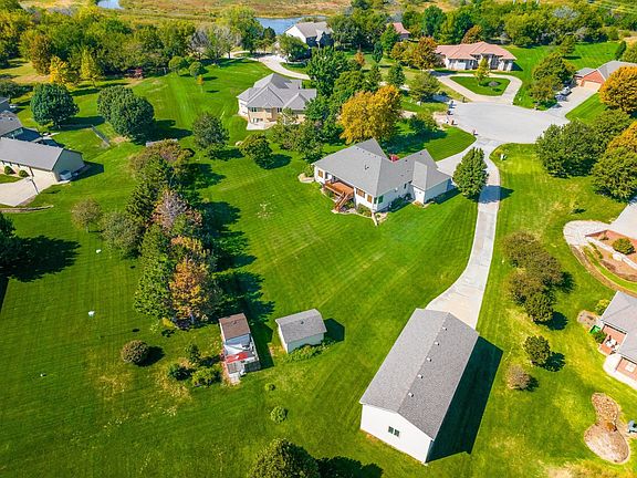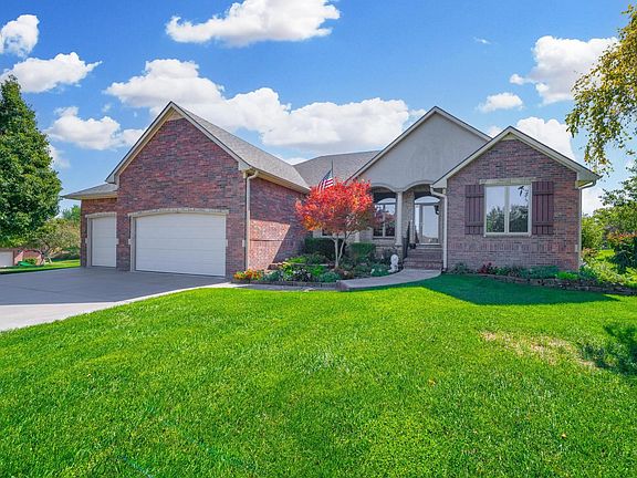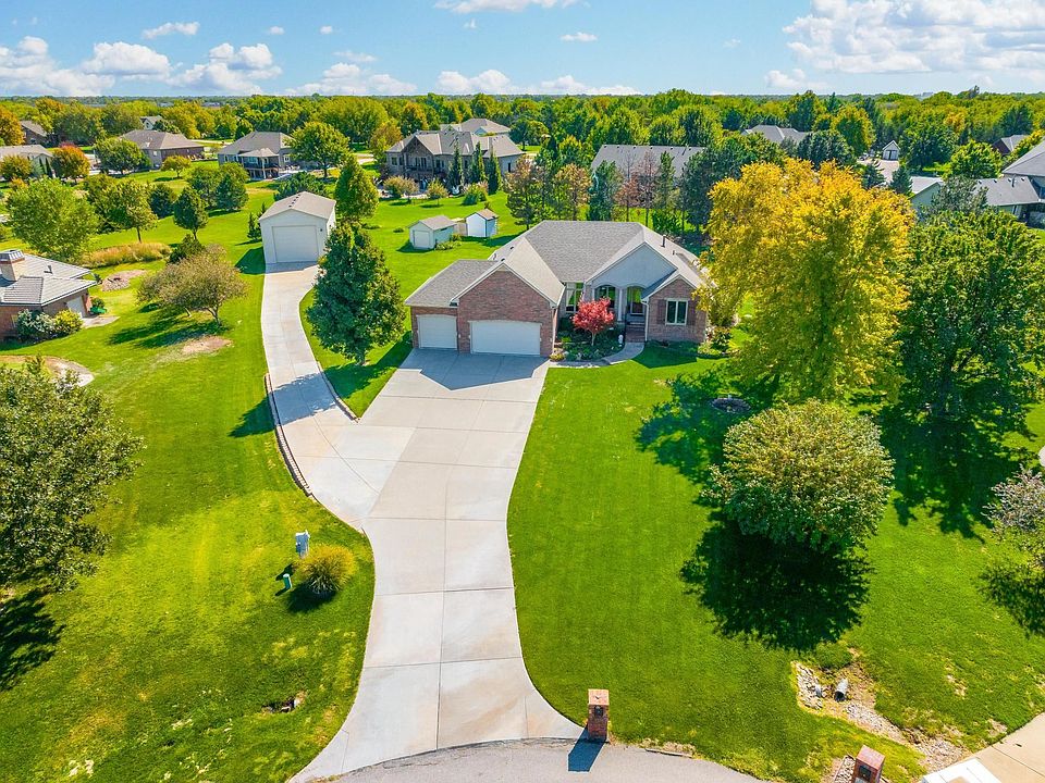 Beautiful home on one acre in town in Maize schools! This Creekside Estates residence is tucked away toward the end of a private cul de sac surrounded by other gorgeous estate homes. Rare opportunity to get into this special neighborhood. Trees, creek and nature surround the development to the west. This brick and stone adorned one-story ranch features 4 bedrooms, 3 1/2 bathrooms, a three-car attached garage plus a 50 foot detached insulated garage with 220 electrical service. The property has been nicely landscaped with a variety of trees and magnificent perennials, rock accents, flower beds, attractive soffit lighting, irrigation well with sprinkler system. Very well-maintained home. The large covered front porch is inviting and the floor plan would work seamlessly for most any lifestyle. This lovely space will surely accommodate all your needs. Kitchen includes an abundance of cabinet and counter space; stove cook top at the island, granite counters and backsplash, nice stainless-steel appliances and wood floors. Plenty of room for an eat-in kitchen plus seating in hearth area. Feels like you have 3 fireplaces... a two-way gas fireplace on main level that can be enjoyed from the kitchen hearth room and from the living room and another one in the basement family room. Newly stained deck can be accessed from kitchen and owner's suite. Back side of home is spectacular with an entire wall of windows! Custom window treatments and blinds. Sellers have updated any windows needing replaced during their ownership. Complete new Trane HVAC 2015, New hot water heater 7 years ago, New Hail Impact Class 4 Malarkey Vista Roof installed 2022! Culligan whole house water softener & reverse osmosis. Enjoy formal and informal dining, main floor laundry with 1/2 bath off the laundry area. Large living room and tall ceilings throughout. The owner's suite has coffered ceilings, gorgeous views of the lush green lawn, tree row and a walkout to the deck. The attached bathroom has been completely remodeled with a new onyx oversized shower with glass door and built-in seat. Store all your favorite outfits in the large walk-in closet. Make your way to the lower level and marvel at the vast space. View out windows offer additional landscaped yard views. Don't miss the oversized wet bar including a mini fridge, tons of cabinetry and counter space to entertain in style. The family room is laid out perfect for lounging, playing or entertaining. The stunning gas fireplace with electric switch is surrounded by a stone and wood hearth. Insulated detached garage and storage shed offer plenty of options to use anyway you choose. RV storage, work shop, man cave or mechanic's space. Wonderful neighbors. No specials and no HOA dues. Let's get you moved in right away, ready for immediate possession.