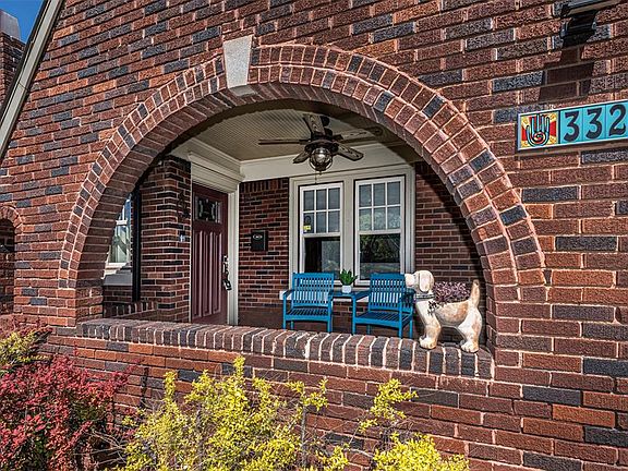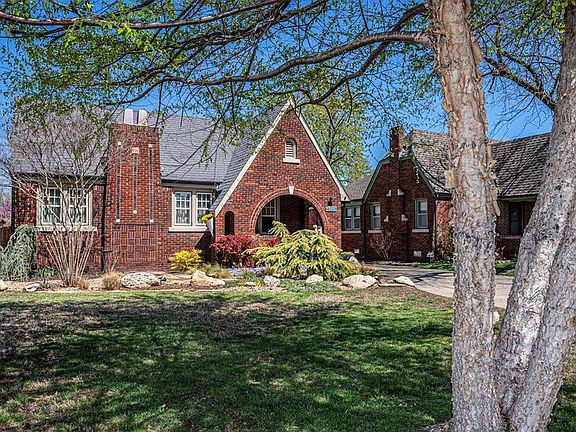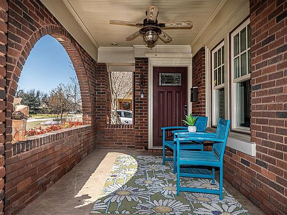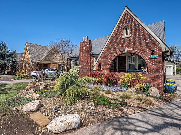Well cared for and classically updated Tudor, in coveted Linwood Place. As you pull in the extended drive, your eyes are drawn to the low maintenance landscaping and the covered front porch that will provide hours of relaxation. Exterior doors have been replaced, and as you enter into the living area you notice the gleaming original wood floors & rich woodwork. The fireplace surround is a masterpiece with sconce lighting and an electric fireplace insert. The dining room gives a glimpse of the kitchen from the convenient pass-through. Kraftmade custom cherry kitchen cabinets greet you, along with the Whirlpool induction oven, Bosch dishwasher, trim line vent (to the outside) granite countertops, and cork floor. Updated laundry room has a sink, tankless gas WH, & granite. From the kitchen, the hallway to the main bath has artfully crafted built-ins with glass hardware- a nod to the past. Imagine soaking your cares away in the free standing bathtub as you look up at the blue sky and clouds of the hand painted ceiling. A shower, pedestal sink, ambient lighting, & heated basketweave tile floor make this a true oasis. The main bedroom has a lightly coffered ceiling & fan. The second bedroom has a walk in closet & blinds that can raise/lower from the top or bottom. The powder bath has fun period-look fixtures and charming wood floor stenciling. There is a small office or sitting area that leads to the staircase ( and don't miss the under stair reading nook). Upstairs, the bonus area has a window seat & built ins, & the bedroom has a faux fireplace and King size bed, that can stay. Updates include: electric/panel & plumbing, insulated floors/attic/walls, zoned HVAC 2023, alarm system, insulated oversized 2 car garage w/storage cabinets & flat safe storm shelter. Garage door opener 2021, fridge 2023. Easy access to Hwy's, Plaza, Paseo, Will Rogers Park and The Trails. This house has so many special touches, you won't want to miss it!