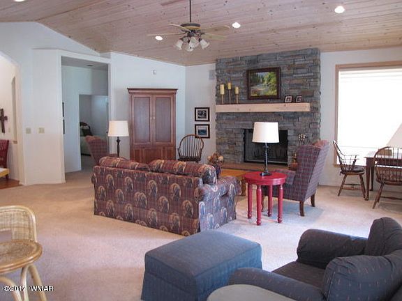 This is a premier home in Pinetop Lakes Country Club with outstanding fairway views from both the living room and dining room areas as well as from the master bedroom. Open concept great room with stacked stone fireplace and vaulted T&G wood ceilings. Foyer and kitchen boast oak hardwood flooring. Master bedroom has its own gas fireplace, atrium door to private deck. Enjoy country club living right on the golf course!