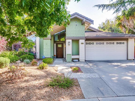 Terrific opportunity to own in a much-desired, beautifully tree-lined neighborhood. This lovingly cared-for, well-maintained home greets you at the door with natural light streaming through the ceiling-high windows, accenting the beauty of the vaulted ceiling, and openness of the spacious living and dining areas that welcome you inside. 1,704 square feet of living space, with 3 bedrooms and 2 full bathrooms. Kitchen offers Corian countertops, glass cooktop, dual convection oven, dishwasher, microwave and refrigerator. Beautifully landscaped, low-maintenance front yard and enormous, park-like backyard, offering relaxing patio area, multiple raised planting beds, and extensive, low-maintenance landscaping. Serene lawn space on one sideyard, and sturdily-built shed and fenced, dog-run along the other. Front-loading washer and dryer; central heat and AC; copper plumbing, and leased solar. Excellent schools, easy access to shopping, dining and quick commute anywhere. Come see it soon!