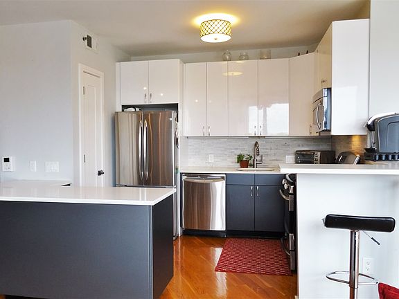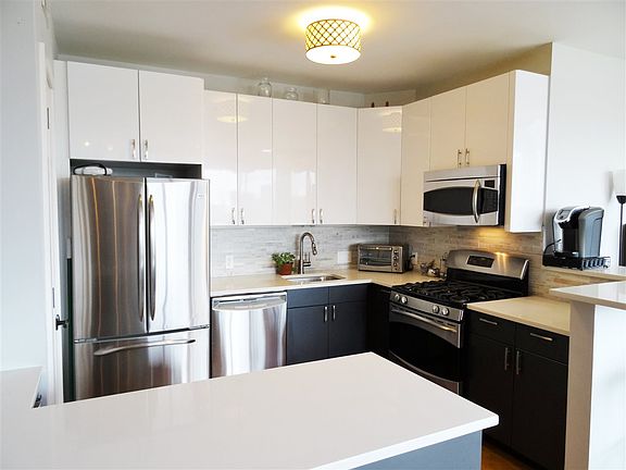 Beautifully sleek, modern 2BR/2BA penthouse level home at The Flats at 327, in Downtown Jersey City. With East & North exposures and high ceilings, this space is filled with light that pours through the oversized windows. Other features include a solid oak floor, SS GE Profile appliances, central heat/air, in-unit laundry, full wall living room built in, custom walk-in closet in master and the kitchen has been expanded for extra storage and counter space. One of 14 modern residences in a structural steel-reinforced converted 19th century building. Elevator, convenient to restaurants, shops, public transportation: 7-minute walk to Grove St. PATH
