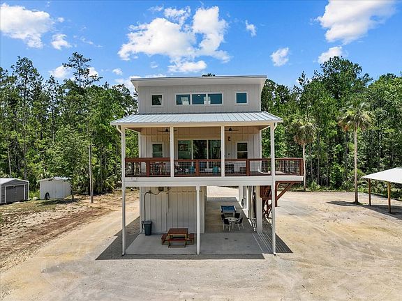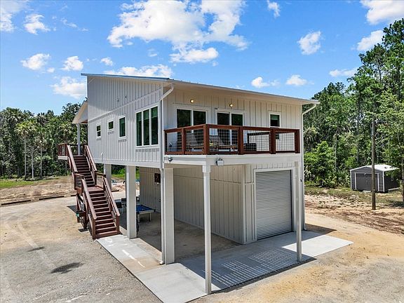 Your Dream Home Awaits on 10 Private Acres Soar above the everyday in this stunning new build stilt furnished home, nestled amidst 10 sprawling acres. Breathe in the fresh air and sweeping views of the surrounding woods from the expansive 22' vaulted living room, complete with a walk-out deck that beckons you to commune with nature. Unwind and entertain in the kitchen, featuring sleek quartz countertops, a deep sink, and all the modern conveniences a chef desires. The vaulted ceilings create a sense of spaciousness, while a loft guest sleeping area or office sits above, offering a touch of privacy. Indulge in tranquility in the master suite, featuring a private walkout balcony – the perfect spot for a morning cup of coffee or stargazing at night. A second bedroom and a conveniently located laundry room round out the upstairs living space. Embrace Florida living under the home, where a concrete patio encircles the entire structure, inviting you to relax and soak up the sunshine. Inside, a 17ft high-ceiling garage offers ample space for your watercraft and park your boat with ease. Attached is a game room for family fun, or can easily convert this space into a guest suite for visiting loved ones with hot/cold plumbed in and drain line to large septic that can handle added new bath and kitchen. Rest assured knowing this over 3600 Sq. Ft. living space is built to withstand the elements. Top-of-the-line hurricane protection provides peace of mind, while a pole barn with complete RV hookup caters to the adventurer in you. No expense was spared with the pump house equipped with a filtration system. Also includes two additional sheds with electricity. Minutes away from the boat ramp leading to the majestic Steinhatchee River and the Gulf of Mexico, Marinas and local eateries, this idyllic property offers the perfect blend of seclusion and accessibility. Explore the waterways, enjoy local restaurants and marinas, or simply unwind in your private paradise. Don't miss this opportunity to own a piece of Florida magic. Contact us today to schedule a tour!