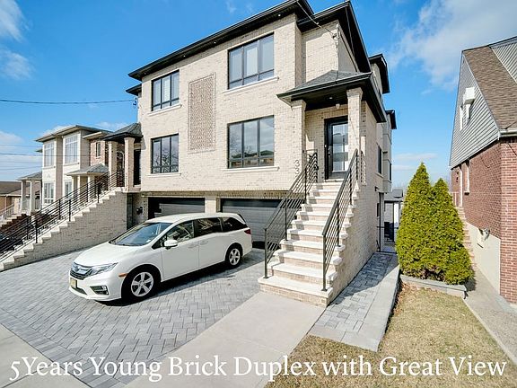 5 Years young brick duplex in the hills of Palisades Park. This home features 9ft high ceilings on the main level with custom moldings throughout with Double Decks. Open living room and dining room concept, fire place, custom kitchen with quartz countertops. Also this home has absolutely beautiful views of meadowlands. Master Bedrooms with en suite spa-like bath and two walk-in closets, two additional bedrooms with full bath in the hallway. Ground Level complete with two car garage, recreation room, bedroom, bath, and side entrance to enclose yard. Additional storage area in crawl space below ground level. Must see the house! 1 Year +