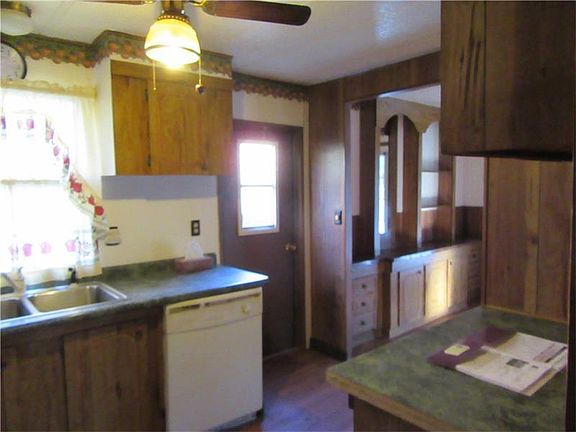 Ranch manufactured home 1980. Home sits on skirting on a large lot with two tax map numbers. Small front porch, large side patio with large storage shed and small shed out back. Country setting with land across road and wooded in back of property. Well water, septic system. Living room, dining room, kitchen. Three bedrooms, one bath and laundry. Needs some TLC and being sold in "as is" condition.