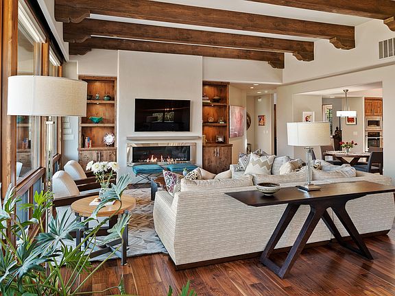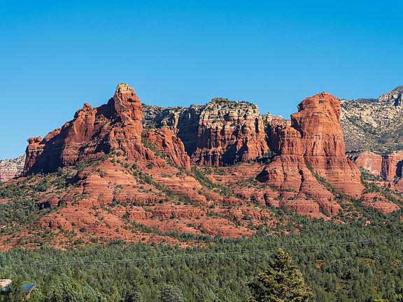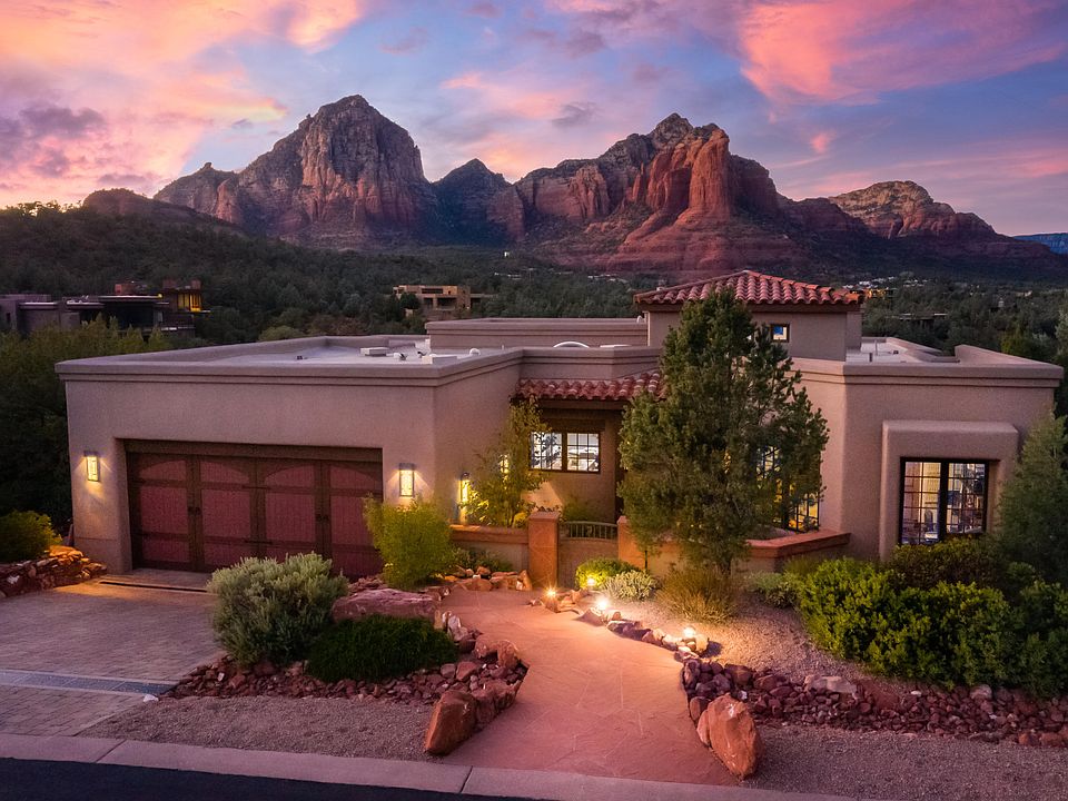 Located in one of Sedona's exclusive gated communities, this 4,000 SqFt home offers stunning unobstructed red rock views, boasts DESIGNER UPGRADES throughout. NEW hardwood flooring, stylish light fixtures, and Hunter Douglas electric shades. The spacious floor plan includes a luxurious primary bedroom suite with a double-sided fireplace, a gourmet kitchen with a gas range and wine refrigerator, and a modern great room fireplace with Sedona's most scenic red rocks. The lower level features two private guest suites with en-suite bathrooms. Rare 3-car garage for this neighborhood. Enjoy the community's resort-style amenities, including a pool, pickleball, and tennis courts, in a safe and serene setting. HOA pays for landscaping, paved roads, gates, trash, and more! Rentals: 6-mo minimum. HOA pays for landscaping, paved roads, gates, trash, and more!