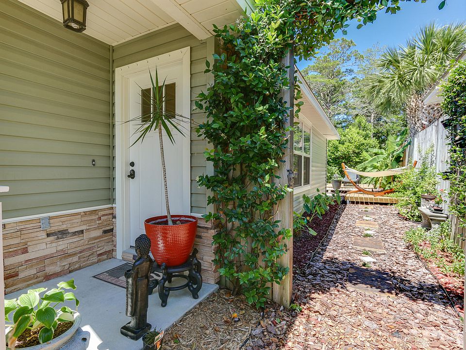 Modern, energy efficient, well equipped, coastal craftsman home, built by Kohnermann-Gibbs in 2014 with significant designer improvements, including coved ceilings, ceiling fans, built-in storage in the master bath and bedroom, wood look tile throughout, plantation shutters in every bedroom, granite countertops throughout, stainless steel appliances, including top of the line washer and dryer, designer paint and trim, two and a half car finished garage with enough driveway space for an army and a home wide patio in the back. Highly energy efficient, including sprayed in attic insulation, high efficiency water heater and a/c, double pane windows and drought tolerant edible landscape design. Modern building design, including roof tie down system and built on, custom Astro guard hurricane fabric for all window openings. Uninterrupted termite bond and in an X flood zone, yet three short blocks to the white sand beach.
