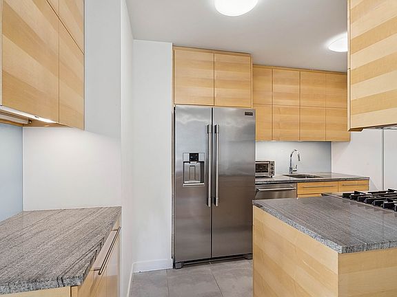 This stunning home has over 65 linear feet of nearly floor-to-ceiling, wall-to-wall windows, offering treetop views of the building’s private landscaped garden from every room. Brilliant natural light and absolute serenity define the space. The expansive layout includes a spacious living and dining area, perfect for both everyday living and entertaining. A partially open kitchen is outfitted with custom cabinetry, granite countertops, glass backsplash, and premium stainless steel appliances. The renovated guest bath features glass tile and sleek, modern finishes. Storage is exceptional with seven closets throughout, including a walk-in. Low monthly charges make this home even more appealing, with common charges and taxes among the lowest in Manhattan. Note: there is an ongoing capital assessment of $432 per month.