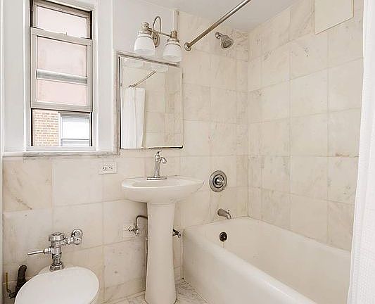The apartment offers a spacious living room with updated lighting, hardwood floors, and elegant crown moldings. The windowed kitchen is equipped with full-size stainless steel appliances including a dishwasher, while the en-suite windowed marble bathroom adds a touch of refinement. The bedroom features two large closets, and with three closets in total, the home provides ample storage throughout.
