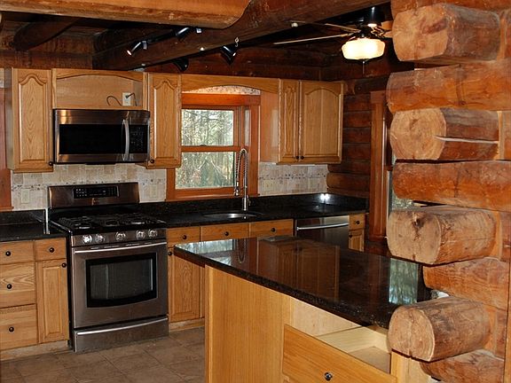 Not quite a cabin in the woods, but it is a log home behind a tree line. The home is nestled at the very back portion of the 2.6 acre lot. The front of the lot is a cleared field that has been hayed in recent times. Keep the field as a green buffer between the home and the road or return it to an agricultural use. While the log walls, exposed log ceilings, and floor to ceiling field stone fireplace offer an authentic rustic vibe, the home has a modern kitchen and bath and is built on a full, poured concrete foundation. The style of a log home isn't for everyone, but a move-in ready 3 bedroom home on 2.6 acres in Rochester for under $430,000 is a solid value.