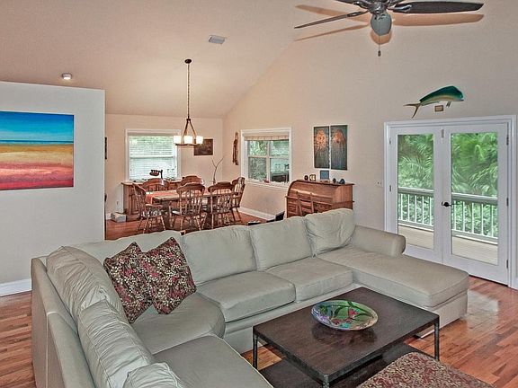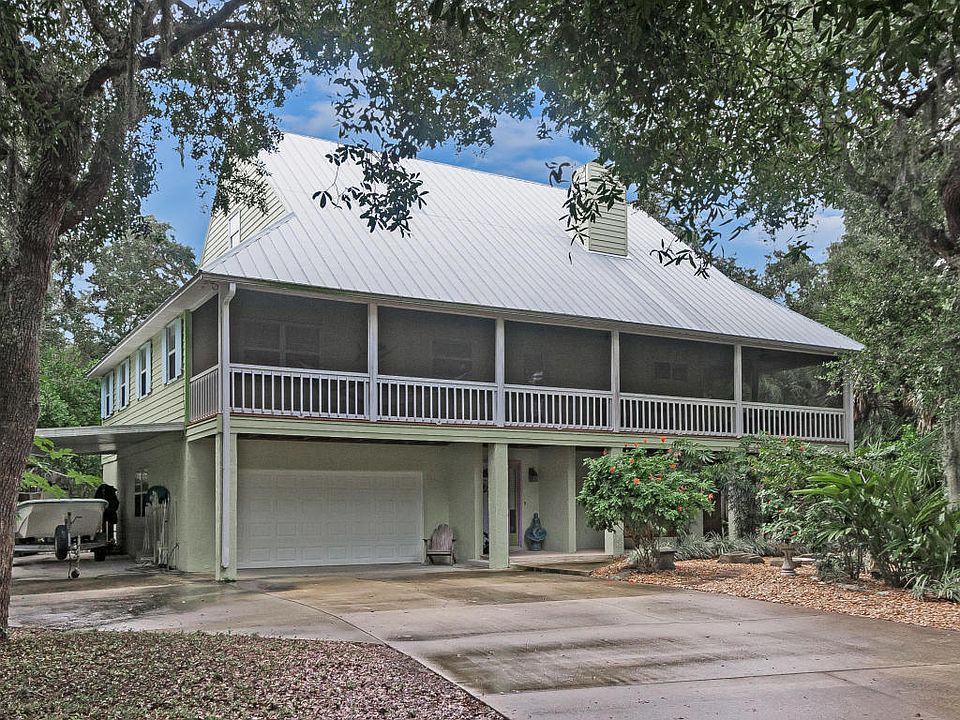 Enjoy the coastal breezes and spectacular sunsets over the ICW as you relax on the huge, fully screened wrap around porch. This fantastic home offers tons of privacy and plenty of room for an RV, Boat and your favorite beach toys. Located near the beach as well as a boat ramp into the ICW. The downstairs suite is perfect for family, friends or roommates with a kitchenette, huge living area, full bath, bedroom and a 2nd entry door on the west side of the home. The upstairs features cathedral ceilings, a fireplace, wood flooring throughout, an updated kitchen with granite and stainless, a beautifully remodeled master bath plus another bedroom and full bath. Additional features include a xeriscape lawn for easy maintenance, a beautiful storage shed, fully fenced yard and much more.