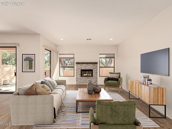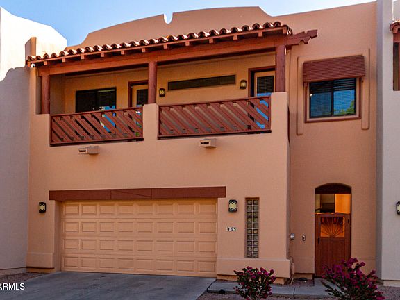 Rare 4-bedroom, 3.5-bath Santa Fe-style townhome on a premium lot in the highly sought-after gated community of Pueblo at Anderson Springs! This beautifully situated two-story home backs to a lush park, offering serene views and enhanced privacy. Inside, you'll find a spacious kitchen, newer flooring, freshly painted and a cozy propane fireplace perfect for relaxing evenings. The primary suite features direct access to a private balcony overlooking the park, while two front bedrooms share a second balcony and a convenient Jack & Jill bathroom. The fourth bedroom includes its own private en suite, ideal for guests. Tech-savvy buyers will appreciate the Cat 6 wiring throughout for fast, reliable connectivity. Recent updates include fresh neutral paint (2025), a 2022 roof replacement, Phantom and custom screens, and a heat pump water heater for energy efficiency. The private front courtyard and spacious back patio provide inviting outdoor spaces for both quiet morning and evening gatherings.