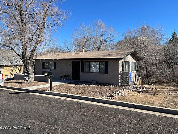Single level affordable home in the central downtown Prescott area.Main level living with 2 bedrooms and 1 bath on main floor. Lower level has bedroom, bathroom and laundry room.Recent improvements in 2019: new hot water heater, remodeled main floor bathroom, new kitchen, new blinds and front pony wall and new rear concrete patio and stairs. Exterior and interior paint. Brand new vinyl sliding glass doors upper and lower. New rear deck, front pony wall and landscaping in 2020. New rear sewer line and north side stairs on side of home in 2022. New furnace in 2023.