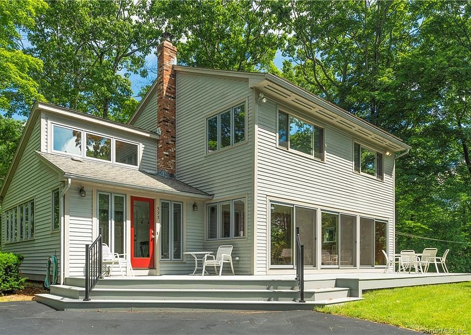 Welcome to your personal oasis! This 5 bedroom, 3 bath home is situated on 3.13 acres on a quiet cul-de-sac. Main house has 4 BR's, and 2 Full Baths, while the detached studio apartment has a full bath. The floor plan is ideal for entertaining and family gatherings. Hardwood Floors and lots of windows create a light and bright living room with vaulted ceilings and wood stove for those cold winter nights. Prep meals in the large kitchen with center island, stainless steel appliances, and plenty of storage. From the kitchen step out onto the spacious deck where you can enjoy your morning coffee or evening cocktail. 1st floor bedroom with hardwood floors for your convenience. Upstairs you will find the primary bedroom with full bath, as well as 2 additional spacious bedrooms. On the lower level you will find a family room with built-ins. 2 car detached garage with a studio apartment above with full bath and extra storage. This house has solar panels and are owned. Close to center of town and shopping for everything you need. Just a few minutes more to get to Guilford's sandy beaches; or nearby is Lake Quonnipaug for swimming and kayaking. Schedule your showing today.