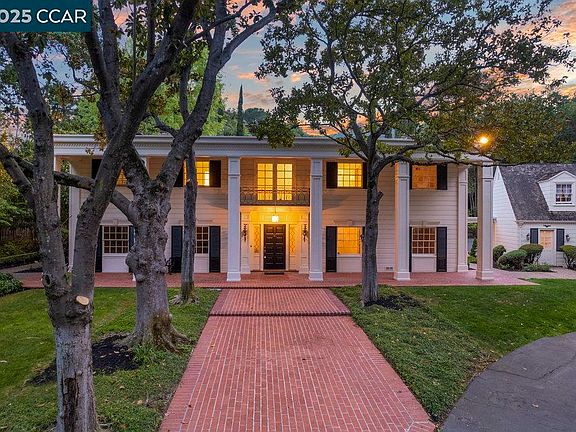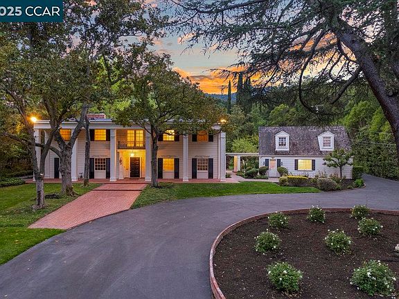 Welcome to The Hartz Estate, a truly one-of-a-kind residence steeped in Danville’s early history. Once home to John Hartz, one of the town’s pioneering founders, this stately Colonial-style home is a rare blend of heritage, elegance and potential—set on an ultra-private, flat 1.58-acre lot just minutes from downtown Danville. Framed by a gated circular driveway and lush landscaping, the estate exudes timeless character. Inside, the main residence offers formal living, dining, and family rooms showcasing exquisite millwork and traditional craftsmanship. The spacious kitchen at the rear of the home offers serene views of the tranquil grounds and incredible expansion potential for a luxury kitchen remodel or great room concept. Upstairs, two different staircases lead to five bedrooms, including a versatile room currently used as a home office. Beyond the main home, the estate features an impressive suite of auxiliary structures: a one-bedroom ADU above the garage, a large pool house with a second kitchen, ideal for entertaining, and a 5,000+ bottle wine cellar. The large, flat lot presents a rare opportunity for subdivision or a complete reimagination into a contemporary family compound.