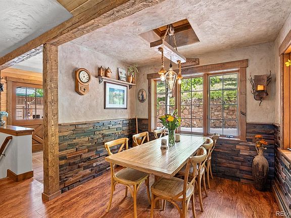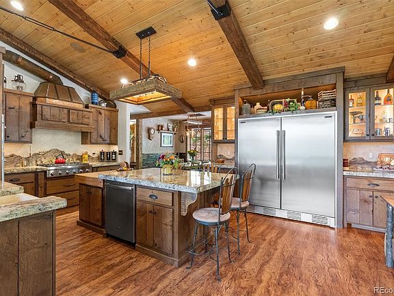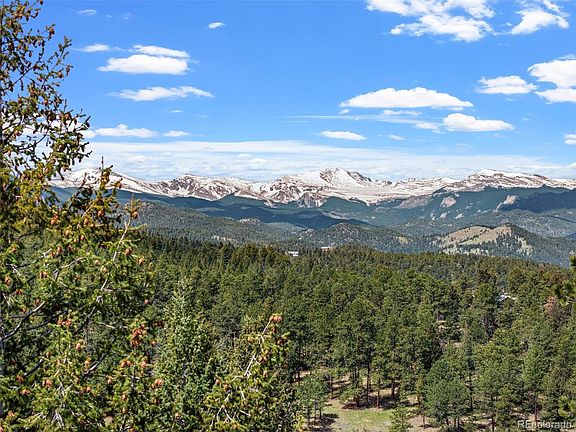 This stunning 10 plus acre pristine natural setting, with unobstructed Mt. Blue Sky Views, is a must-see luxury log-sided home with separate guest accommodations. This fully paved and gated serene property also includes a quintessential large red barn with 3 lofts and concrete floor, augmentation rights for a second future well, a seasonal creek and plenty of room for horses. Professional custom workmanship can be seen throughout the home. Inside you will find masterly crafted cabinetry, timber beams with iron accents, and more. The heart of the home’s open concept features a gourmet kitchen complete with stainless steel appliances, full door refrigerator and full door freezer, custom cabinets, copper hood and granite island with seating for four, a chef’s butcher block and a walk-in pantry. Experience a seamless flow into the vaulted great room and be mesmerized by the expansive snowcapped Mt. Blue Sky views or enjoy the floor to ceiling moss rock wood burning fireplace. In the spacious main floor master, wake up to stunning Mountain Views. The ensuite primary bath features a large walk-in stone tile shower and custom cabinetry with chiseled-edge granite countertops. The walkout lower level offers additional living space including second and third bedrooms, a full bath, an office or family room, a versatile den with ample closet space with a Murphy bed, and a laundry room with plenty of storage. Outside you will find moss rock walls, enhanced natural landscaping and flagstone patios to name a few. Step through the doorway to your outdoor oasis and enjoy the large deck with spectacular mountain views, abundant wildlife, a built-in natural gas fire pit, a lighted river rock water fall and landscaped pond. The heated greenhouse is the perfect touch for any gardener. The detached oversized 2 car garage includes area for a workshop. A whole house generator is also included. This private secluded retreat is a must see to appreciate.