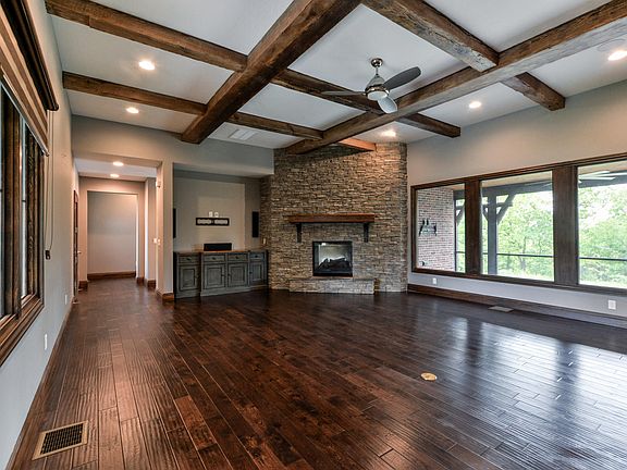 NEW PRICE! Award winning Rick Ramsey built home. True Ranch home w/3,000 sq ft on one level. Prepare to be impressed by the huge list of upgrades including: engineered flooring, heated tile floors in kitchen & dining, custom shades w/black out blinds, touch faucets, censored toilets, pocket doors, see thru fireplace in Great Room & Living Room, nice office, huge covered screened in porch, en suites for each bedroom w/walk in closets, surround sound, soaker tub, & so much more! Also built in tornado shelter. Situated on 3.06 acres in the prestigious Saddlebrooke Village w/mountain views & on a dead end street. Amenities include pool, tennis court, playground, creeks, pavilions & friendly people! Only 10 minutes to Branson & 20 min to Springfield. Live where the speed limit is 33 mph.