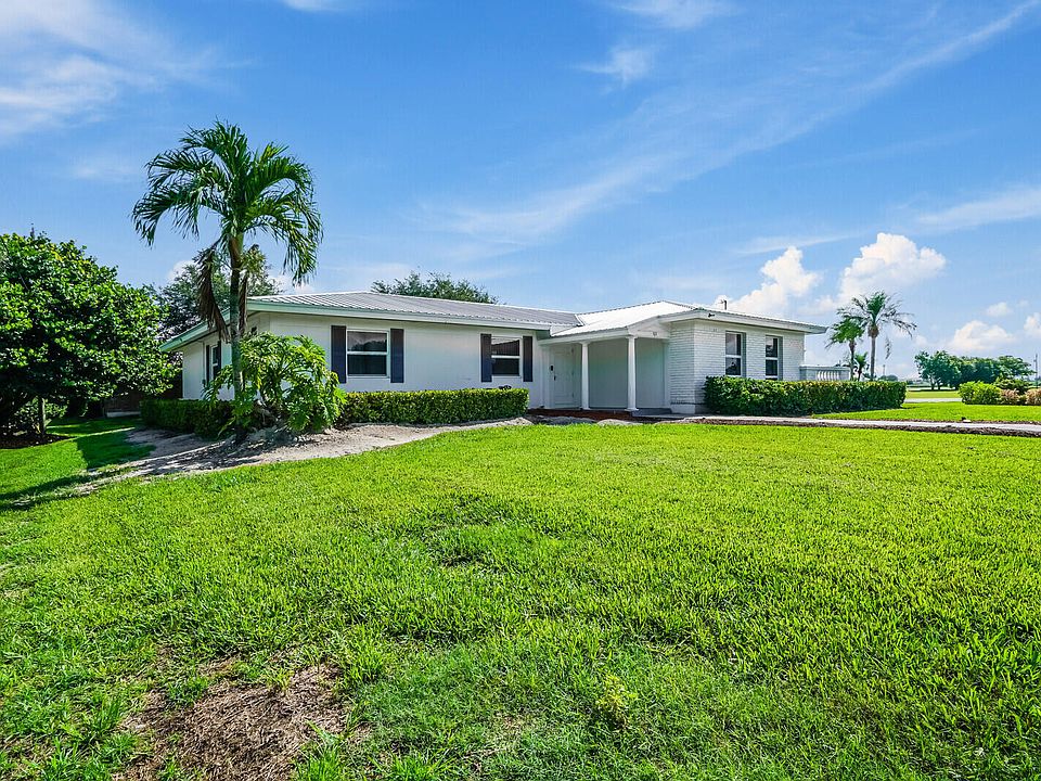Beautifully maintained home with newer Metal roof and impact windows. Home features 3 bedrooms, 2 baths, large living room formal dinning, family room, large laundry room with cabinets and 2 pantry storage closets gas dryer, waterproof laminate flooring through out the home. Kitchen features 5 burner gas stove , granite countertops , wood cabinets, oven and refrigerator, tankless gas hot water heater. Large Screened patio has gas hookup for grill and room for hot tub. The master bedroom has a large walk in closet and dressing area. This home is on a corner lot and has a side entry garage with asphalt driveway. Covered porch entryway plus a side open terrace with French doors leading to dinning room.