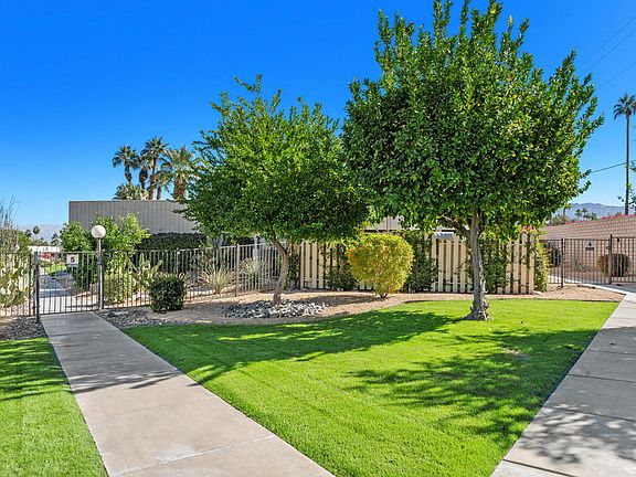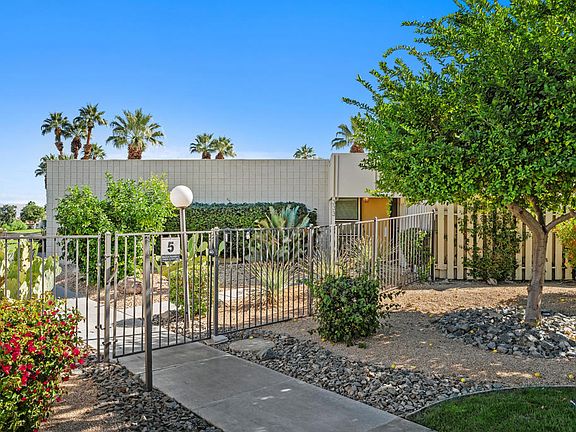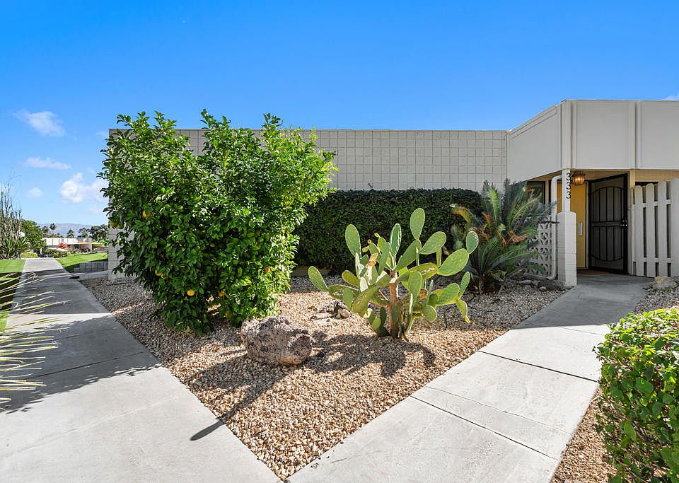 Discover the charm and architectural significance of this classic mid-century William Krisel-designed home in Sandpiper Palm Desert. Ideally located just steps from the fine shopping and dining on El Paseo, and close to scenic hiking trails and bike paths, this 3-bedroom, 3-bath residence offers 2,015 square feet of living space in a quiet, private setting at the back of the community. Enjoy the best of desert living with lush greenbelts and panoramic mountain views. Original architectural details--breeze block accents, tongue-and-groove wood plank ceilings, and signature block walls--create an authentic mid-century atmosphere. The home features double-pane sliders throughout, two spacious private patios, and a third patio overlooking the beautifully landscaped common area--perfect for entertaining or quiet relaxation. The oversized primary suite opens to a large private patio and includes an ensuite bath with dual vanities, a Roman tub, and a generous walk-in closet. Two guest rooms offer comfort and flexibility for family or visitors. A newer foam roof, redone approximately three years ago, adds peace of mind and energy efficiency. While the home retains much of its original charm, it's ready for your personal touch and creative vision. Sandpiper Circle 3 holds official historic designation with the City of Palm Desert and qualifies for the Mills Act program, which can provide a significant reduction in property taxes. With no rental restrictions, this property also offers excellent potential as a primary residence, seasonal retreat, or investment opportunity. One reserved carport space is conveniently located near the front door.