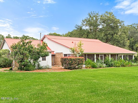 Beautiful Brick Farmhouse on 4.61 acres! Enter this estate through the gated entrance and come down the long concrete drive to your beautiful 2 story home with an oversized 2 car garage. Inside the home features tile and wood floors throughout, a fireplace in the formal living room, lovely kitchen with solid surface countertops and brand new stainless appliances. The enormous primary bedroom is on the 1st floor with a large walk-in closet, beautiful ensuite bath, and french doors leading to the screened lanai. Downstairs also offers a guest bedroom with an ensuite bath and an additional hall bath. Upstairs you will find two huge guest rooms with another full bath. Out back there is an enormous 13'x50' screened porch perfect for entertaining! There is also a 4 stall barn with a tack room/workshop & a 1/2 bath. The entire property is fenced and cross fenced. There is a brand new ac, new water heater, new garage doors, newer well pump, and much more! There is also a large carport for your RV, Boat, or other toys with Electric and Water/sewer hookups on-site. Only 1 mile from a public boat ramp on the St. Johns River not far from where Bass Pro Shops owner Johnny Morris just bought thousands of acres for a highly anticipated resort amongst other things.