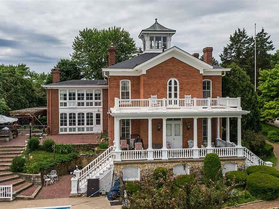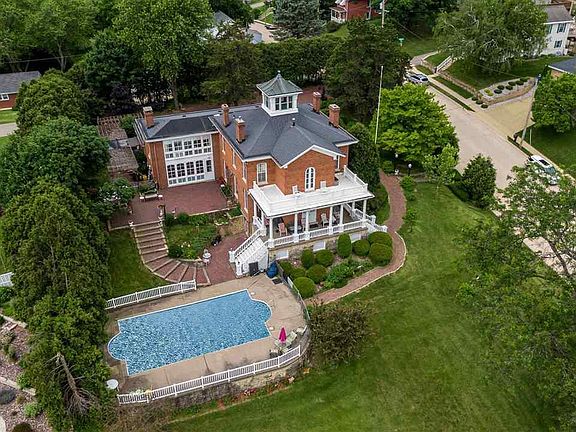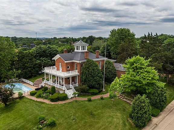 "The Villa on Villa Street"...This stunning brick home located over looking the City of Dubuque and The Mississippi River. Breathtaking views that are near impossible to find. Built in 1886, this home features all the charm of a begone era, with all the comfort of updated modern conveniences. Main floor consists of formal dining room, sitting parlor, library and more casual family room with wood burning fireplace conveniently located next to the kitchen. Upstairs has Master Bedroom suite, with walk in closets, and one of the best views in the Midwest. The three other bedrooms are located in a different wing of the home, with one bedroom boasting of an on suite bath. Plenty of closet space with each bedroom having walk ins. Character abounds from the wood curved 2nd staircase to the copper roofed cupola. 1st floor covered porch and 2nd floor grand balcony offer a wonderful place to relax with friends and family, while seeing the sites of the city and river. Walk out basement has another family room, work shop and wet bar. 4 car garage offers plenty of space for autos and toys. Enjoy your 40x20 pool while watching the river boats go by. There are few properties that can offer this quality of a home with such a tremendous view.