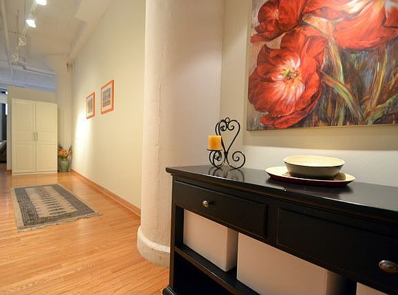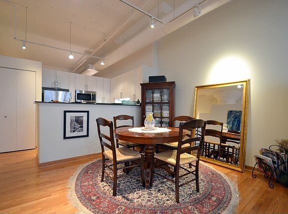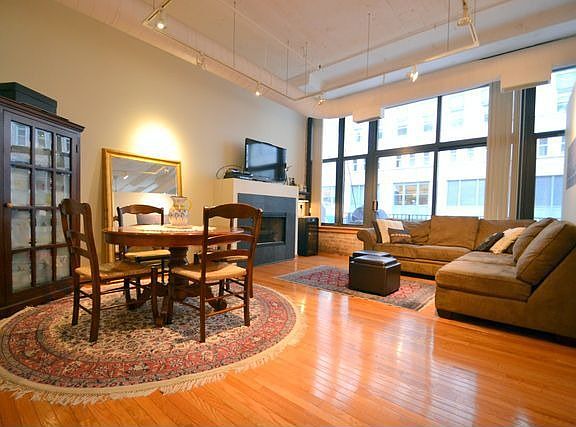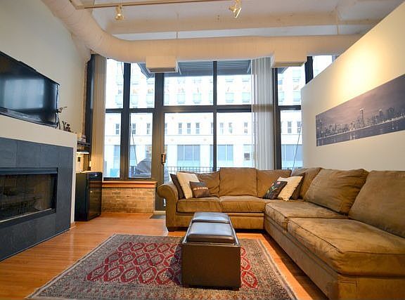 Gorgeous designer renovated loft filled with light from huge south facing windows and 11 ft ceilings. Features include hardwood flrs, fireplace, beautifully updated kitchen and baths. Both bedrooms are fully enclosed for privacy. Master suite offers large walk in closet. Prvt deck, washer/dryer in unit, extra storage. Perfect river north location- walkable to east bank & loop. 1 garage parking space included.