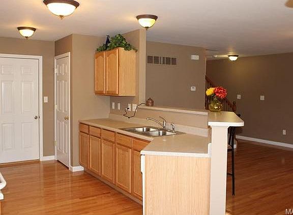 Enjoy the ease of villa living in this lovely townhouse in O'Fallon! Enter to the open layout of the main floor with the bright living room flowing into the breakfast room and kitchen. You'll love the gleaming hardwoods that run throughout the space, as well as the breakfast bar and stainless steel appliances. The breakfast room opens to the deck that overlooks the level backyard. Upstairs, the master suite is a retreat with dual walk-in closets and a full bath with glass shower doors and large vanity. Another spacious bedroom, a full bathroom, and convenient laundry room complete the space. The lower level has plenty of room for storage and is ready for your finishing touches with a bathroom rough-in. Enjoy community amenities: pool, clubhouse, basketball courts, pond, and playground, plus lawncare and snow removal included. You'll be just moments from highways, schools, shopping, and restaurants. Don't miss out on this one!