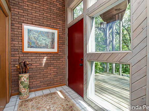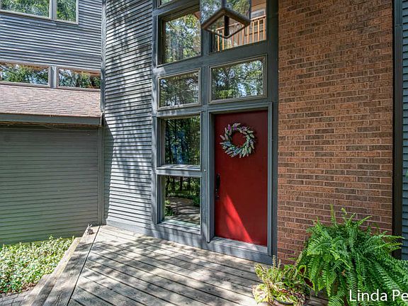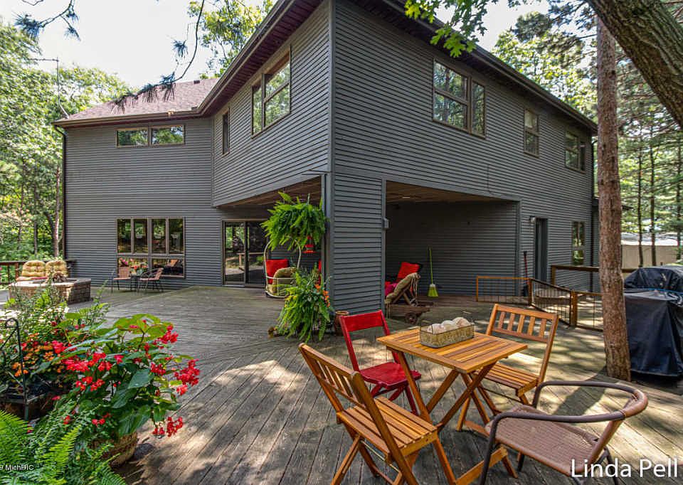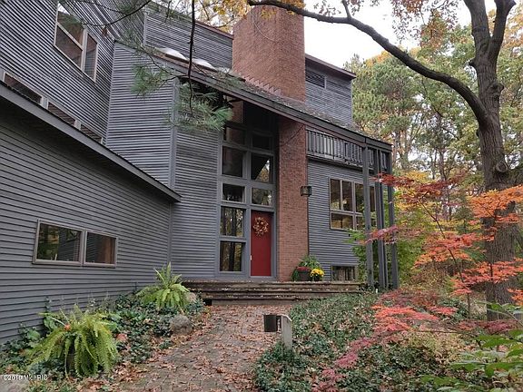 Algoma Township - Rockford: Offering a unique custom designed home on a private wooded 2-acre site, nestled among a handful of like-kind residents. Four stories of amazing architecture are centered around the focal brick fireplace pillar. Each living space has a backdrop of green spaces, as viewed through multiple windows, glass doors and skylights. Main floor living includes an open updated kitchen, cosy living - dining areas, a great-room family room and main floor bath, mudroom and laundry. The 1200+ outdoor deck is perfect entertaining space, useable for several months of each year. The upper story of this home features an open stairwell, spacious bedrooms, updated baths and excellent closet space. The master suite includes both a fireplace and private deck. The lower level