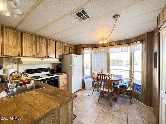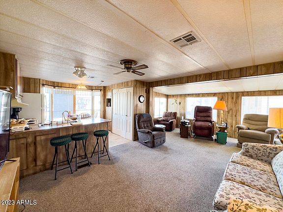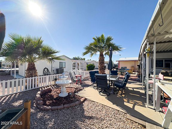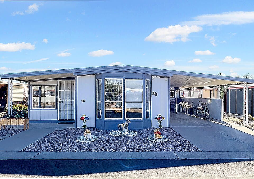 MAJOR PRICE IMPROVEMENT FOR QUICK SALE! This GROUND LEVEL 1BR/1BA home is just steps from the pool in this GATED 55+ COMMUNITY. Close to shopping, restaurants, banking and. more. The light-filled eat-in kitchen is spacious with front bay window, a breakfast bar for extra seating and ample cabinet space. Captivating Arizona sunsets unfold in the VAST REAR COVERED AND UNCOVERED PATIOS with plenty of room between neighbors. Large living room with room addition offers additional flex space for office, hobbies and/or guest area. SPDS indicates updated plumbing, room addition roof replaced (2020) & manufactured homes roof just recoated i(2023). Covered carport offers an extended driveway for PLENTY OF PARKING with easy access to a 10' X 20' storage shed. Residency approval required, pets okay!