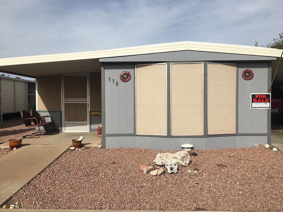 UPDATED. New Front & Side Security Doors. New Vinyl Dual Paned Windows. New Light Fixtures-inside & out. New Ceiling Fans. New Solar Privacy Screening. Extended Storage with Double Doors also workbench & shelving. Fenced pet area. Updated Kitchen with New Stove. Updated Bath with tile Shower. New Washer & Dryer included. Well Cared for & Clean! In Cypress Estates. Pet Friendly, Quiet, 55 Plus. Please Call 520-414-1426 to see or with any questions. LOT # IS 338 (sorry for error)