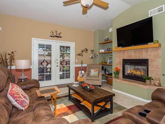 Corner location w/in Courtyards @ The Gardens-Gated 55+ community w/amenities. Common area to side & rear provide more elbow room. "Willow" 1109sf plan [feels larger] 2 bdrm, 2 bath, 2 car garage. Interior w/easy care tile floors in key living spaces, carpet in bdrms & vinyl in baths. Enjoy fireplace in "just the right size" Great Room/Dining area. Security screen entry door @ front + French doors to cov'd + open patio areas-ideal for natural air flow. Attractively "re-landscaped" front & back w/artificial turf & fenced yard for your furry friend Wall of built-in cabinets with countertop workspace + storage closet in garage, all appliances included, 3 skylights, ceiling fans thru-out, chair rail, rich interior colors +++ Can be purchased TURNKEY-furniture apprx 1yr NEW. SHOWS BEAUTIFULLY