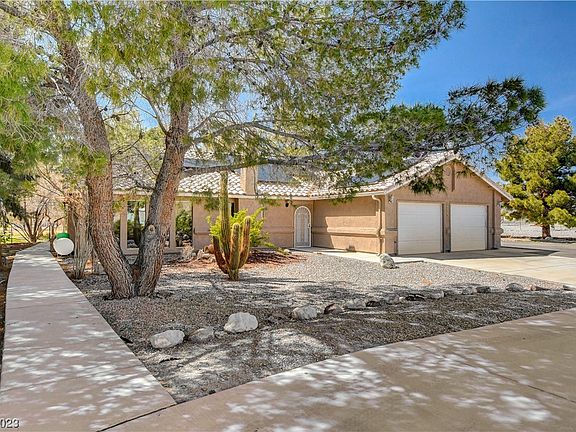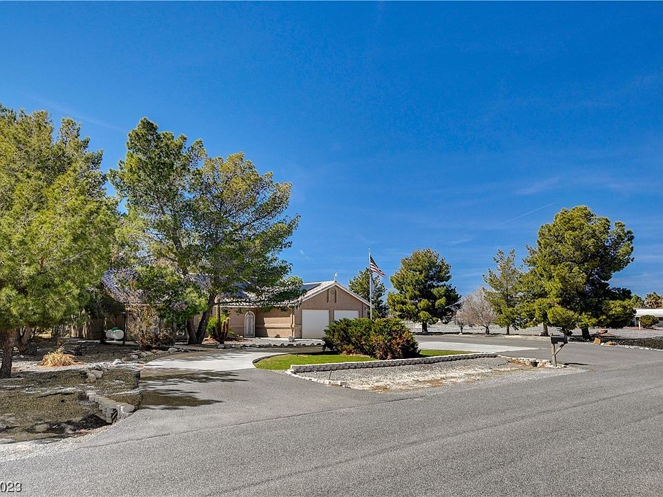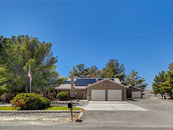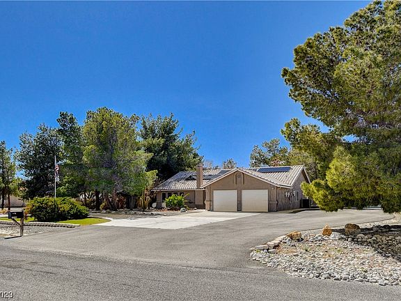 Over an acre of land within the ever expanding Nye County. Nestled into its own personal forest setting framed in trees, this single story fixer is a blank canvas for any buyer. Pushed back off the main road, drive up the long driveway to a quaint little home oozing curb appeal. A unique floor-plan complete with front sitting room, open living space with custom stone accent fireplace, separate breakfast nook, and back sunroom. The possibilities are endless. Master bedroom with separate tub and shower faces the expansive yard. Breeze through one secondary bedroom connected to a massive shared closet space into the 3rd bedroom or office space. The sprawling grounds are complete with a 3rd car garage/workroom/storage area. Items to note; Newer AC unit and solar to convey with the home.