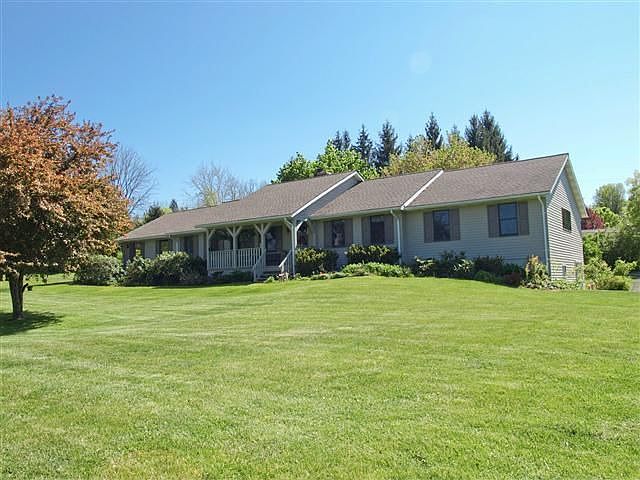 Just a few minutes from the center of Stone Ridge, but privately situated at the end of a long paved driveway on 4+ acres, you will find this custom-built, cedar-sided ranch. Take in the mountain views and landscaped front yard with flowering trees while relaxing on the open front porch. As you step inside the living/great room you will be impressed by the massive bluestone fireplace, vaulted ceiling, newly-refinished, random-width birch and maple floors and freshly painted interior.