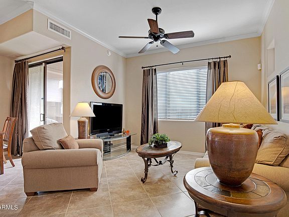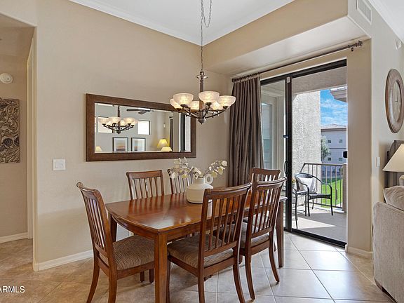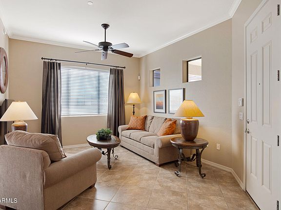 FULLY FURNISHED 2-bedroom, 2-bathroom unit in the gated luxury complex of Santana Ridge. Just bring your clothes & toothbrush! Offering a high standard of living with contemporary conveniences, exclusive amenities, and heightened security measures in an attractive Chandler location. This SECOND LEVEL unit guarantees peace from upstairs noise with no disruptive neighbors overhead. Home highlights include 20 x 20 porcelain tile flooring, Crown Molding, 42 inch upper Cherry Cabinets, Granite Countertops + Backsplash, SS Kitchen Appliances, Custom Levolor Window Coverings, Upper Laundry Cabinets, 10ft Ceilings, Security Screen Door, Owned Water Softener and Fresh 2023 Interior Paint. Well-appointed guest bedroom offers comfort, ample closet space and brings in natural light. The primary suite has a private outdoor patio to relax & enjoy all year round as well as a gorgeous view of the manicured grounds.