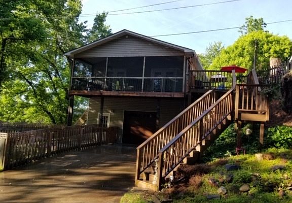 Just steps from Historic Blue Ridge Main Street Shops and Restaurants. The Central Business District zoning allows this residence to be a single family home, weekend or long term rental, retail/restaurant space or any combination. 2 bedrooms 2 baths with cathedral ceilings, open concept great room with brick accent wall and chunky log mantle, small gas fireplace, modern kitchen with sky lights, Butcher block counters, SS appl., screened porch, front and back yard with Astro turf and privacy fence. A huge garage that can be turned into living space with French doors (provided). Large decks allow for ample room to entertain or just relax. Driveway parking or use the pull under garage. 2 adjacent commercial buildings also for sale facing East First Street. Combine all 3 for anything you can imagine. See MLS #294529 for information on the commercial buildings.