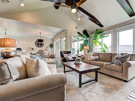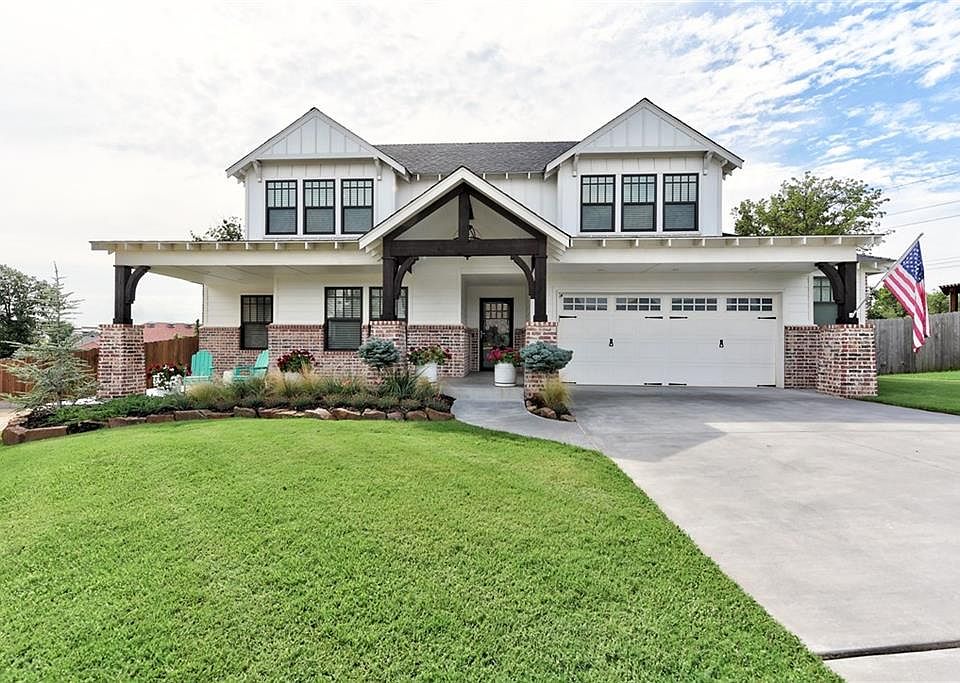 This Beautiful 4 bedroom Craftsman Historic inspired home rests on a Large Lot in a cul-de-sac. Enjoy beautiful views from your Outdoor Living Space or watching the Oklahoma Sunsets from your front porch. The home is Open and Spacious with a panoramic view on the backside of the home. The Living Room Has High Vaulted Ceilings with Wood Beams, a built-in Media Center, (indoor/outdoor speakers), and Shiplap Fireplace. The Kitchen has a Large Island with a Breakfast Bar that has extra cabinets on both sides, & TONS of counter space for Food-prep. The Dining Room has a Built-in Buffet with a Beverage Fridge. The Homeowner "bumped out" the downstairs to add extra space to the Main Living, Dining and Master Suite. The Neighborhood has a Fishing Pond with a Floating Dock, a Park, & Walking Trails. The Buyer may OPT-in for an extra $499 per year for the AMAZING Residence Club/Fitness Room/Recreational Room and Resort Style Pool.There is a Storm Shelter in the 2 1/2 car oversized garage.