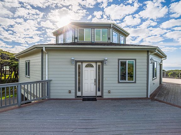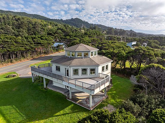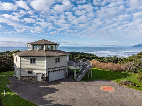 Discover the unique charm of coastal living in this distinctive three-story octagon-shaped residence, boasting panoramic 360-degree views from a viewing room designed to captivate and inspire. This coastal gem features a versatile lower level with a two-car garage, entertainment room, spacious laundry, and an office or optional bedroom, complemented by a full bath. Ascend the accessible hardwood staircase with an optional chair lift if needed to the main living area, where functionality meets elegance in a galley kitchen with ample storage and a pantry. The living space extends to three bedrooms, including a primary suite with an ensuite, a shared bathroom, and an inviting deck off the kitchen, offering serene ocean views. Embrace the unparalleled beauty and tranquility of ocean-side living in a home that combines comfort with the awe of nature's vistas. Perfect for those who appreciate a home with character and the promise of memorable gatherings and peaceful retreats.