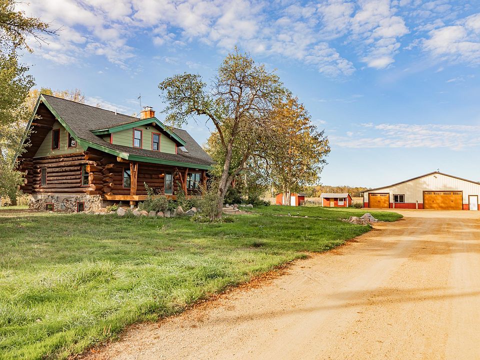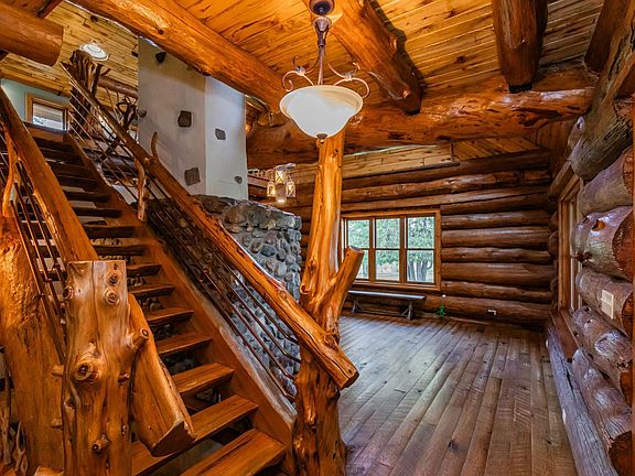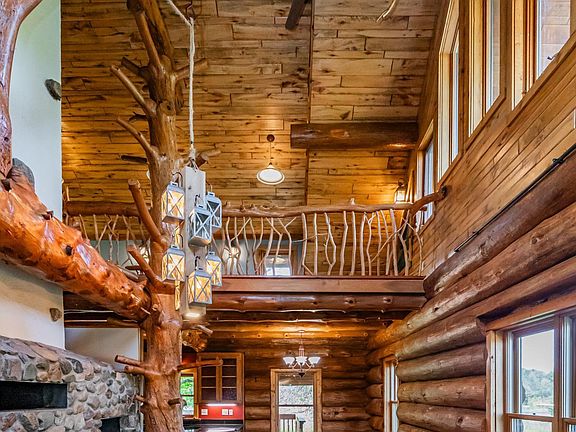 Unrivaled custom craftsmanship in this 5+BR/3BA hand-cut, hand-peeled, full log, old-growth pine home situated on 11 acres w/3400+ sq/ft pole building. Enter into front foyer & be immediately greeted by impressive full log staircase. Continue to massive great room w/soaring ceilings, exposed beam work, custom picture windows & sight lines to kitchen & dining rooms. Kitchen boasts custom cabinets providing ample storage, granite, SS appliances, gas range & door to back deck - perfect for morning coffee. 2BRs & full BA round out the main level. Step upstairs into large loft family room, w/ railing overlooking LR below. Spacious primary suite w/ensuite 3/4 BA & WI closet. 4th BR on 2nd level has ladder to crows nest play space. Walkout LL incl. 2 more BRs/offices, full kitchen, FR w/ wood stove & laundry/utility. New boiler & backup elec system. Home is situated on 11 quiet acres w/multiple out buildings, pastures, & massive pole shed w/heated office for hobbyist or small business owner.