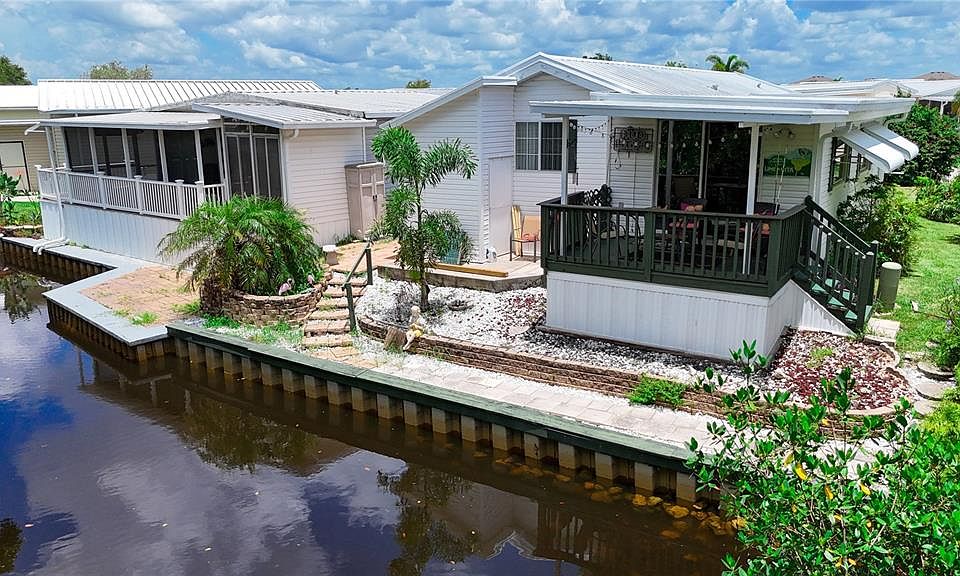 OFFERS WELCOME ON THIS FURNISHED, TWO BEDROOM, 1 1/2 BATH MOBILE HOME IN ACTIVE 55+ COMMUNITY. Enjoy the water view from the rear deck overlooking Sugar House Creek. The large living room leads through sliding doors out to the deck where bird watching and even a bit of fishing can be enjoyed. Split floor plan. Front bedroom has an en suite half bath. PET FRIENDLY, appliances included, stacker washer & dryer in laundry closet. Plumbing lines replaced, central a/c (2016), metal roof, storage shed, and covered front patio. Home is being sold in AS-IS condition, with right to inspect. CASH ONLY! This property offers an opportunity to update and make it your own. The community has NO LOT RENT and low HOA fees of just $525 per quarter which include water, sewer, trash, grass mowing, basic cable and internet. Amenities include two swimming pools, heated spa, clubhouse, tennis & shuffleboard courts, workshop, fitness room, and an active social calendar during the winter months. SO MUCH TO OFFER! What are you waiting for? Pack the pooch and start enjoying your Florida life!