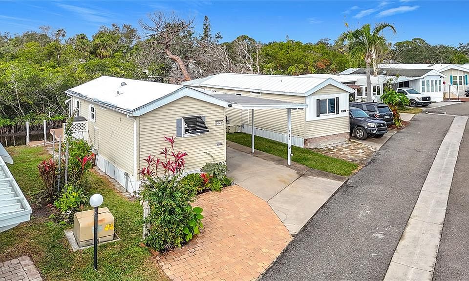 PRICE REDUCED! This FULLY FURNISHED home with HURRICANE IMPACT WINDOWS and BOATABLE WATER IS AN INCREDIBLE VALUE. Relish the tranquil views and the opportunity to fish or boat directly from the BRAND-NEW, LOW-MAINTENANCE TREX DECK/DOCK -- no worries about rotting wood. Dock your boat in navigable waters that lead to the Braden River and ultimately to the Manatee River. The home features a BRAND-NEW ROOF (installed December 2024) and HURRICANE-IMPACT WINDOWS THROUGHOUT, excluding the sliding door and storm door. A WALL BED in the great room offers convenient accommodations for visitors. Vinyl plank flooring flows throughout, with tile in the bathroom. The interior has been FULLY UPDATED with solid surface countertops, stainless steel appliances, refinished cabinetry, and fresh interior paint. The bathroom boasts a spacious shower with TWO GRAB BARS for safety and peace of mind. VAULTED CEILINGS and wainscoting add a touch of elegance. For added convenience, there's a stackable WASHER AND DRYER INSIDE, plus extra storage in two utility closets. Located in the gated, active, adult Sugar Creek community, residents enjoy free RV, trailer, or boat parking on a first-come, first-served basis. Low community dues ($175/month) cover security with the gated entrance, lawn maintenance, cable, internet, water, trash, sewer, clubhouse access, and amenities. Sugar Creek offers two pools -- a large heated lap pool and a Cool Pool.