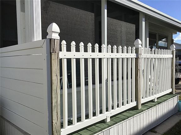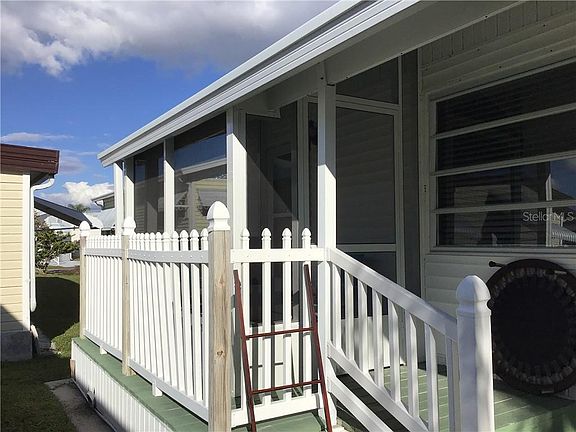 MOVE IN READY, FURNISHED MOBILE HOME IN ACTIVE 55+ COMMUNITY. 2 bedroom, 1 bath. Covered side patio. Two parking spaces, metal roofover. Newer laminate floors throughout home. A/C replaced in 2017. Appliances included. Second bedroom steps out onto screened porch. HOA has low fees of just $150 per month. Community has two swimming pools, heated spa, tennis & shuffleboard courts, clubhouse, fitness room, workshop, and many opportunities to make new friends. Home may be leased after one year of ownership. Sorry this is not a dog lot.