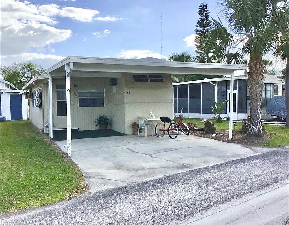 OFFERS WELCOME ON THIS COZY GETAWAY IN ACTIVE 55+ MOBILE HOME COMMUNITY. This charming unit with a rustic flare is ready for you to add your personal touches. This fifth wheel has been added onto with a spacious living room, carport, and large 5'x23' storage room. There is an eat-in kitchen, one bath with tub/shower combo, newer vinyl flooring. The long living room has a closet at the back beside the laundry closet. A portion of the living room could be sectioned off to create a second bedroom. Refrigerator & range included. W/D hookups for stacker unit. Metal roof, window unit a/c. The home has extra storage under the front on the fifth wheel. The interior is on three levels, so you have a few steps. Great potential! NO LOT RENT! The community has two swimming pools, heated spa, workshop, coin laundry, clubhouse, fitness room, tennis & shuffleboard courts, and plenty of opportunities to make new friends. Sold in as-is condition, with right to inspect. Sorry, this is not a dog lot.
