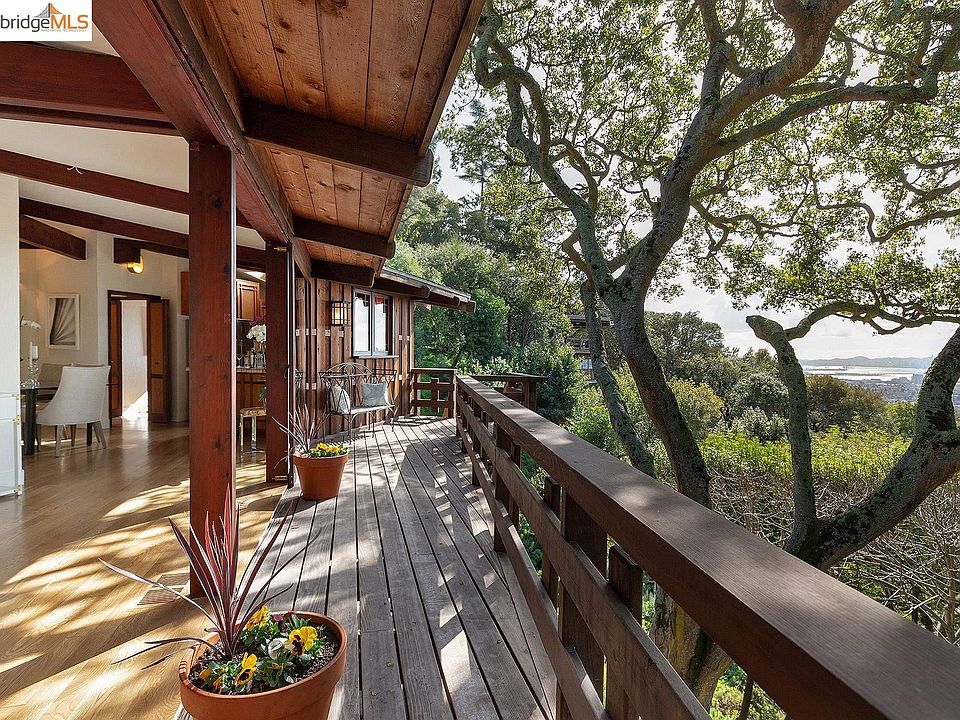 Top of the world expansive San Francisco Bay and Bridges views & privacy! Walls of glass lead to towering, magical oak trees that surround outdoor decks.Refresh your soul with quiet & calm. 3 bedrooms, 1.5 bathrooms. Large primary bath with giant tub that looks out onto the serene wooded and San Francisco City and Bay views. Incredible property on four lots with a beautiful stream that runs through. Get away from it all, and be the next steward of this fine property! Amazing gem!