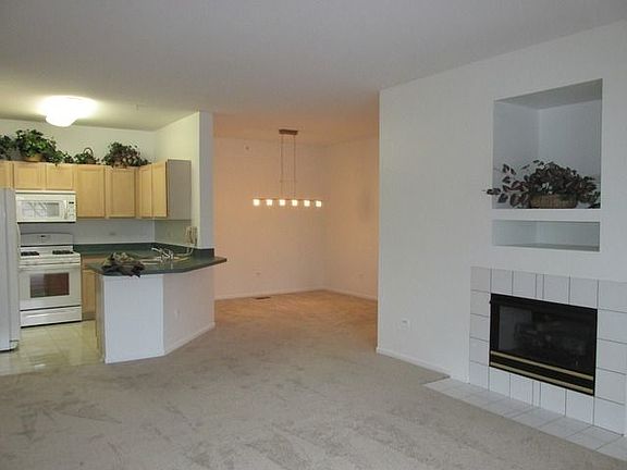 Enter into a large LR/DR area with a beautiful fireplace and a just a few steps away from a nicely-sized kitchen with eat in island. Raised ceilings throw-out the unit. The split master floor plan provides privacy, with each bedroom having a private full bath. This condo is truly move in ready and has new carpeting, appliance, bathrooms and freshly painted! The spacious bedrooms have ample closet space. A very large private balcony just off the living room offers a view of the pond. There is additional balcony storage room. The in-unit laundry with full size washer and dryer, plus 1 car detached garage provides space for all your needs.
